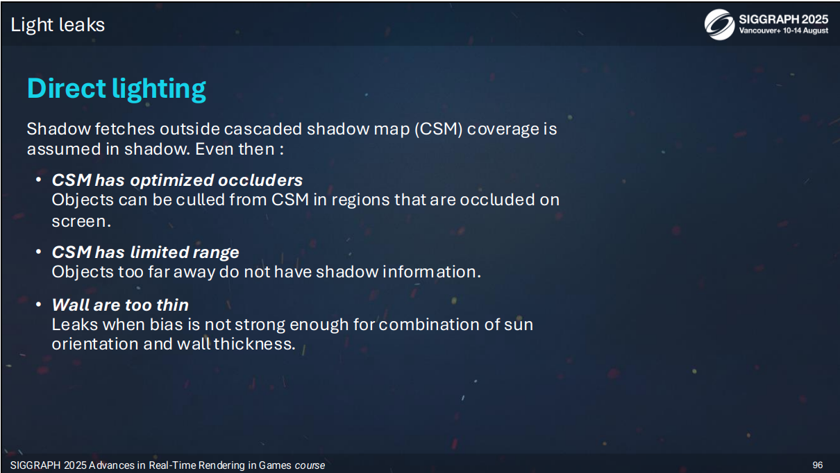 - CSM은 화면에 직접 보이는 픽셀을 기준으로 최적화되어 있기 때문에, 프러스텀 안에 있지만 화면에는 가려진 지점에서는 섀도 값이 부정확할 수 있습니다.