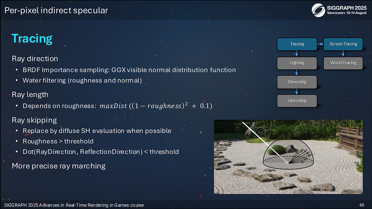 - 스페큘러 반사의 경우, 일반적으로는 화면 공간 레이마칭 길이를 줄여서 아티팩트를 줄이고, 물 표면처럼 레이 시작점이 BVH 경계 가까이에 있는 경우에는 오히려 레이마칭 길이를 늘려서 더 많은 원거리 기하를 끌어오는 식으로 조정했습니다.