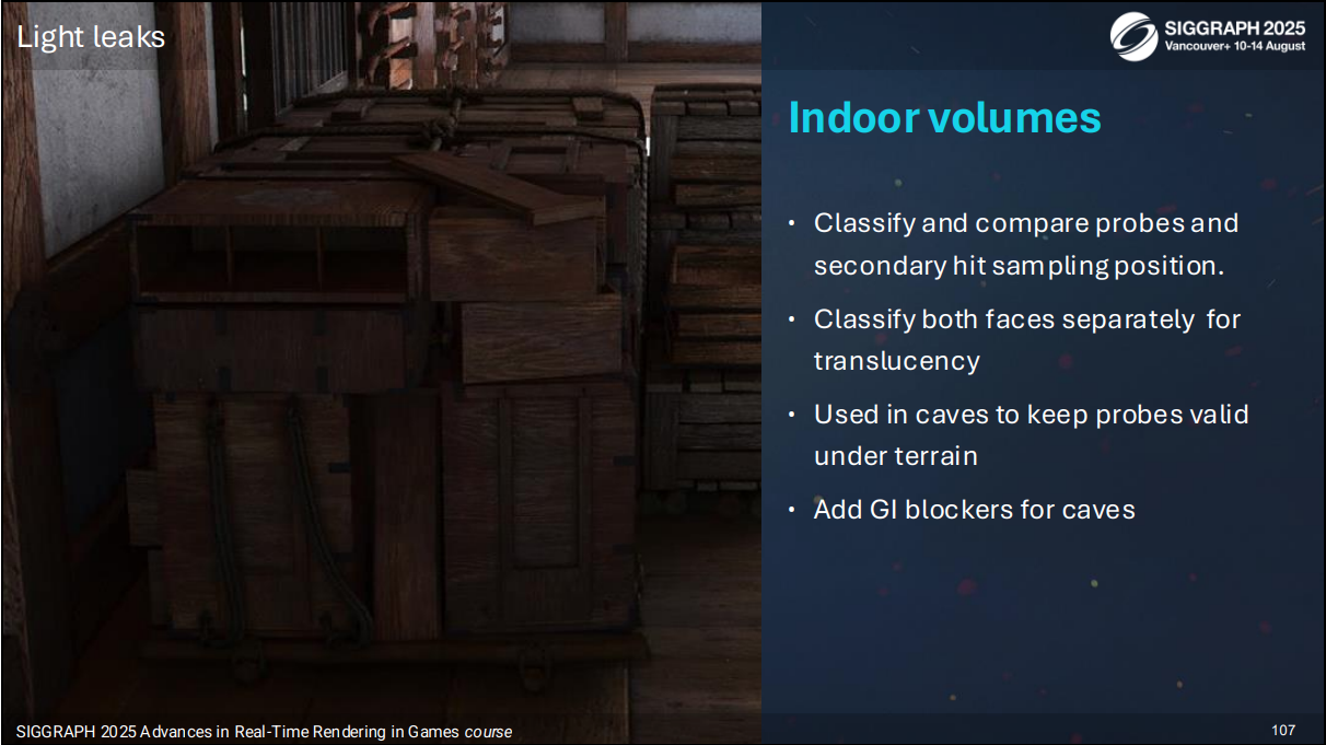 각 프로브는 실내 또는 실외로 분류되고, 프로브 볼륨을 사용할 때는 먼저 히트 지점이 실내인지 실외인지 분류한 뒤, 동일한 분류를 가진 프로브만 사용합니다.