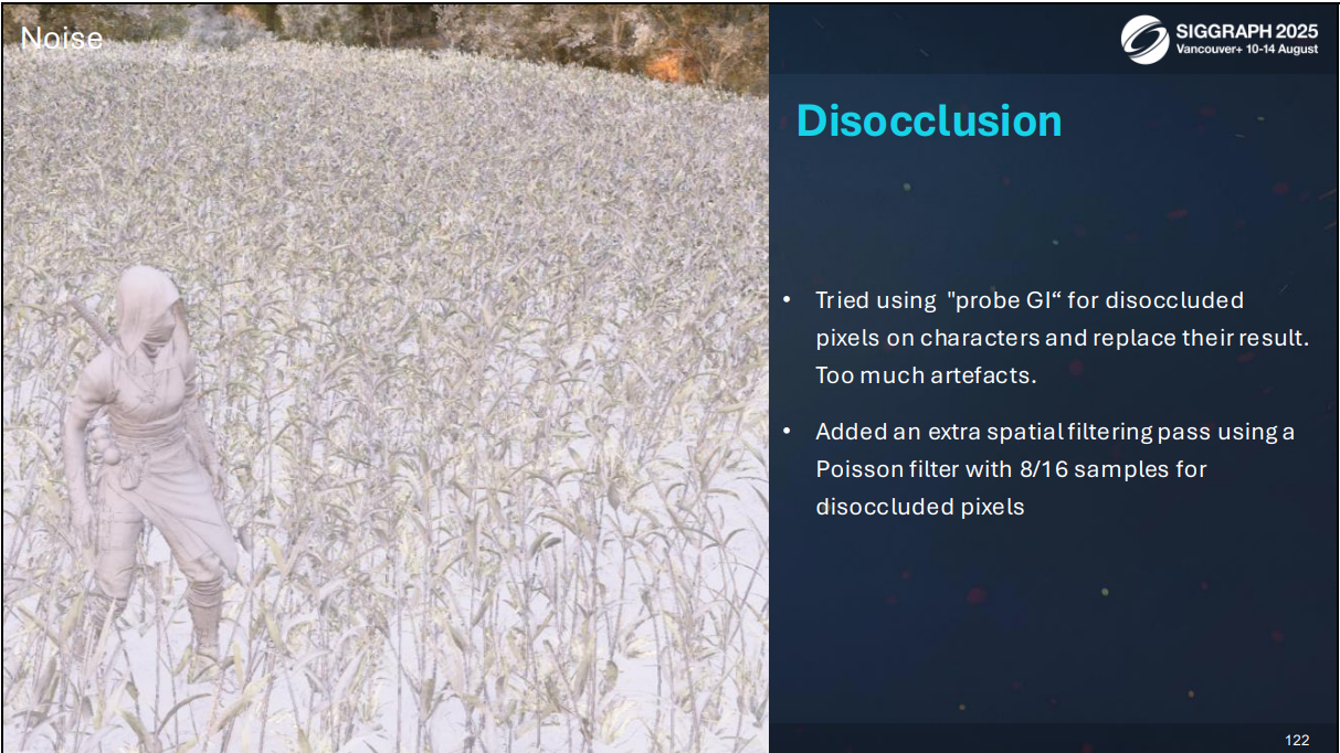 이 문제를 줄이기 위해, 디소클루전 픽셀만 따로 모아서 추가 공간 필터링 패스를 한 번 더 돌려 주는 방식을 사용했습니다.