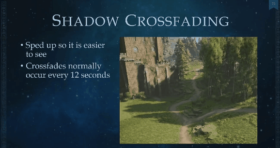 많은 게임이 주야 전환 조명 효과를 구현하는데, 조명 방향이 이동하면 그림자 캐시가 무효화됩니다. 한 가지 방식은 조명 각도 변화가 일정 임계값을 넘을 때, 새 조명 방향의 ShadowMap과 기존 조명 방향의 ShadowMap을 페이드 아웃/인하는 것입니다. 다만 이런 방식은 엄밀한 느낌이 좀 부족합니다.