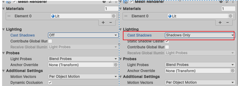Unity에서는 원본 모델의 Cast Shadows를 Off로 바꾸고, 그림자 프록시를 Shadows Only로 설정하면 됩니다. 참고로 그림자 프록시는 잘못된 셀프 셰도우를 유발할 수 있는데, 이 부분은 뒤에서 좀 더 자세히 다루겠습니다.