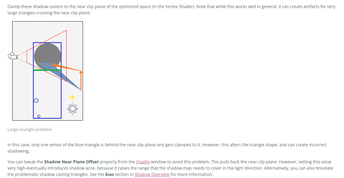 그리고 Unity가 사용하는 Shadow Pancaking 기술이 유발하는 셰도우 오류 문제가 있습니다. Unity는 ShadowMap의 Z 정밀도를 최적화하기 위해, 그림자 투영 행렬의 니어 플레인(원래는 투영 오브젝트를 감싸야 함)을 Cascade 바운딩 구체의 접선까지 당기는데(아래 그림 초록선), 초록선 밖으로 나간 투영 오브젝트를 주황색 화살표 위치로 Clamp합니다. 이렇게 하면 확실히 ShadowMap의 깊이 정밀도가 올라가고 셰도우 아크네 문제가 줄어들지만, 극단적인 경우에 셰도우 이상이 생길 수 있습니다. 해결 방법은 Shadow Near Plane Offset을 조정하여, 초록선을 조명 반대 방향으로 오프셋하는 것입니다.