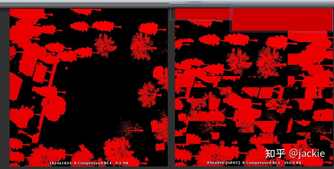 중간 정도 이미지 비교 — 원본 256K(BC4 기준 절반 계산, 2x2 블록 후 절반), 내 압축 방식은 173K. 이미지에 392/2 = 196K로 표시된 이유는 상단 파란 박스 영역이 활용되지 않아서다. 최종적으로 모든 1024 뎁스 이미지를 하나의 아틀라스로 합치거나 64x64 픽셀의 Texture2DArray로 만들면 이런 낭비 공간은 없어진다. 참고로 이 이미지에서 사방 트리는 215K였다.