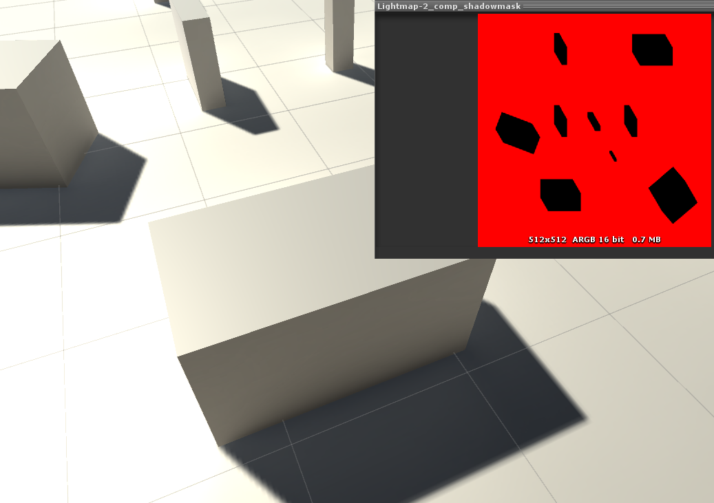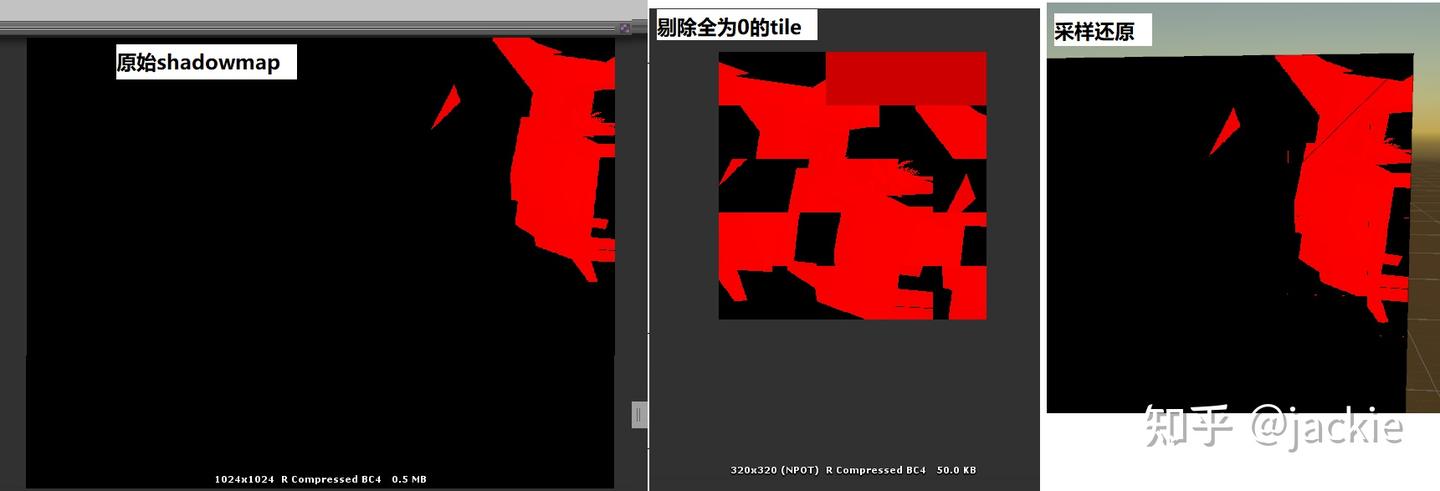 원본은 DX1로 500K다. 물론 원본에도 rgba로 2x2 블록 구성 후 DX5를 적용하면 256K가 된다. 사방 트리 + 블록 방식은 215K다. 이 정도 복잡도의 이미지에서는 최적화 효과가 크지 않다. 계산식은 print(2 * allCount * 1024 / 1024 / 1024 + "K") 인데, 노드 트리가 픽셀 수에 대응하기 때문에 1024x1024 DX5 또는 alpha8 이미지의 VRAM 용량은 1M이고, 사방 트리는 텍스처가 두 장 필요해서 x2다. 그림자가 적은 뎁스맵에서는 사방 트리 압축률이 매우 높다. 값이 0인 자식 노드를 대량으로 병합할 수 있기 때문이다. 그러나 그림자가 많은 영역에서는 뚜렷한 압축 효과가 없다. 고정밀 뎁스맵에서는 인접 픽셀이 계속 달라져서 병합이 어렵기 때문이다. 이건 shadowmask처럼 넓은 범위가 동일한 값(1이거나 0이고 경계 부분만 다른 값)으로 채워지는 경우와는 다르다. 바로 이런 이유로, 그리고 셰이더 내에서 트리를 조회하려면 추가 샘플링이 5번이나 필요하다는 점 때문에, 대량의 뎁스 값이 서로 다른 이런 압축 요구에 더 적합한 방식을 생각하게 됐다.