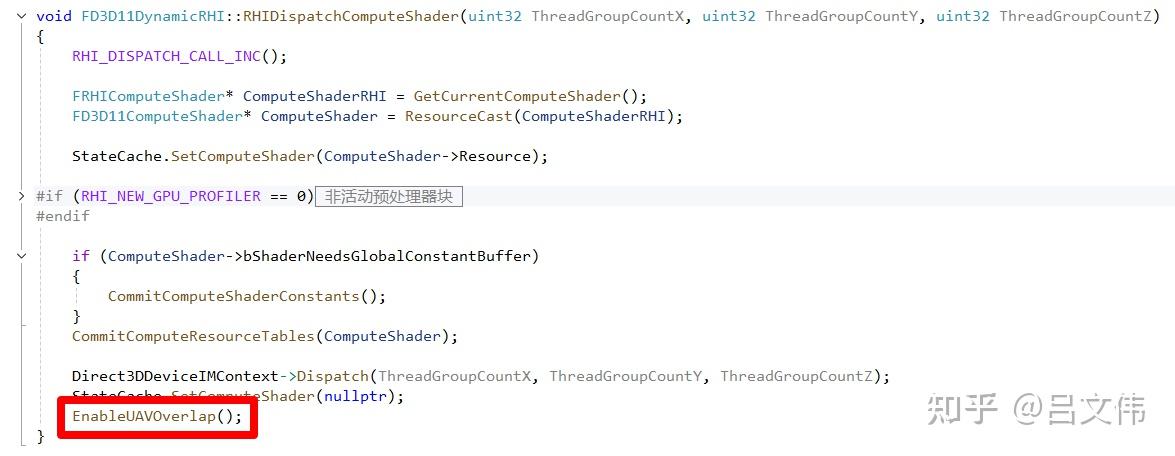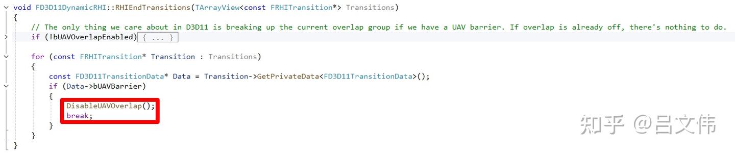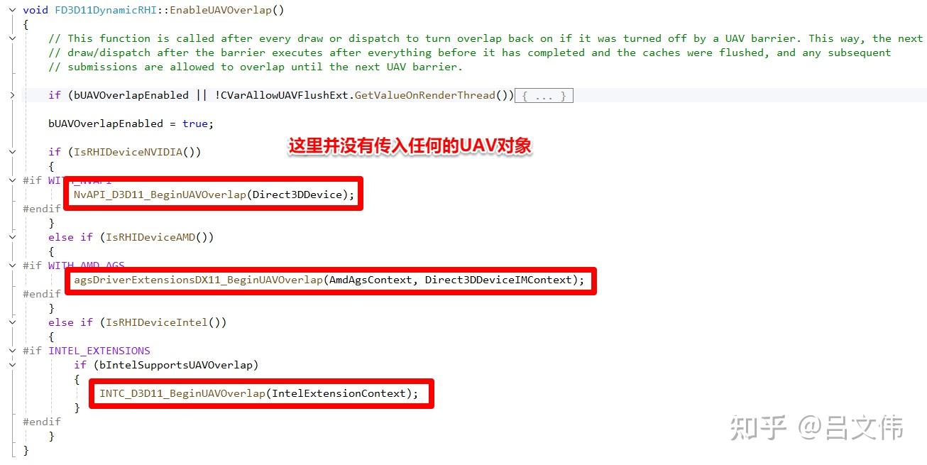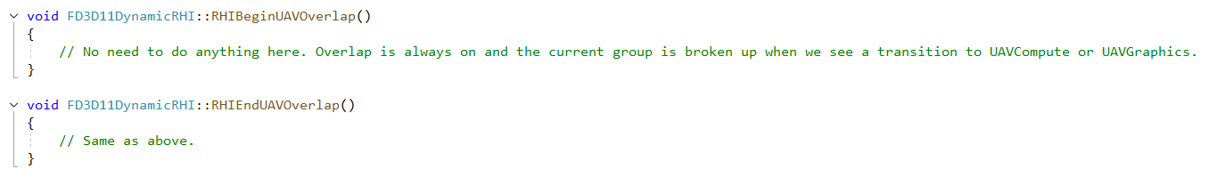 위 그림처럼, D3D11RHI에서 이 두 함수는 빈 구현체다. 아무런 로직도 없다. 계속 따라가다 보면 또 하나의 사실을 발견하게 된다. UAV Overlap은 기본적으로 자동으로 활성화된다. 예를 들어 아래 그림처럼 EnableUAVOverlap 함수를 호출하면 드라이버가 UAV Overlap 기능을 켜도록 만들 수 있는데, 주목할 점은 관련 API에 UAV 객체를 전달할 필요가 없다는 것이다. 즉, 현재 작동 중인 모든 UAV 객체에 일괄적으로 적용된다.
