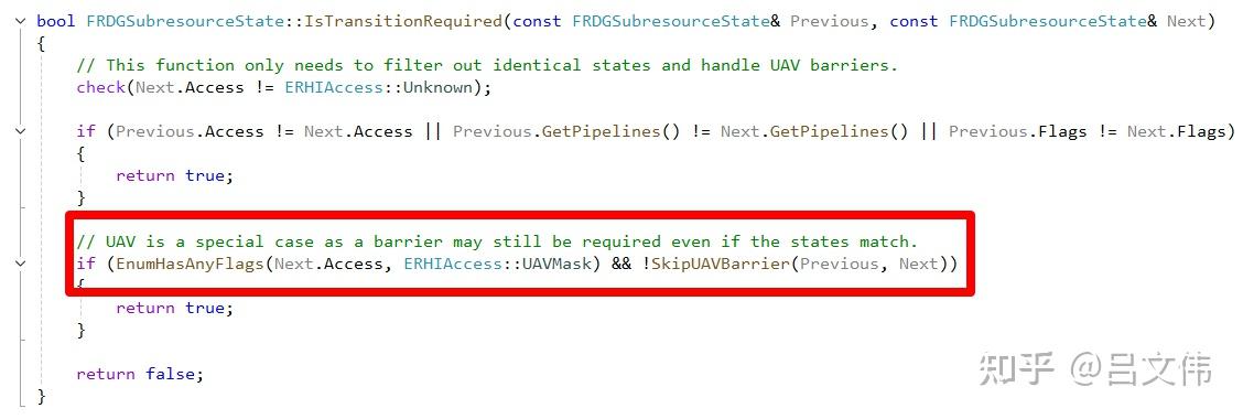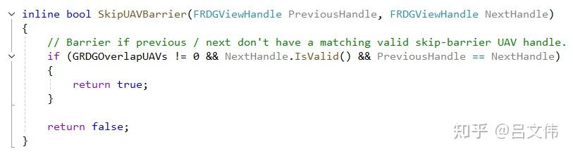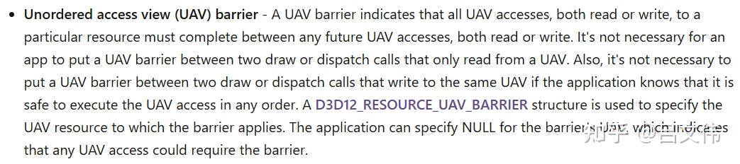 그렇다면 D3D12RHI는 UAV Overlap을 어떻게 처리할까? D3D11과 마찬가지로, 수동으로 Transition을 추가해야 한다. 최종적으로 FD3D12StateCache::FlushComputeShaderCache가 UAV Barrier를 추가한다. 아래 그림에서 알 수 있듯이, UAV의 Resource Barrier는 구체적인 리소스를 지정할 필요가 없다. 전역 동기화 포인트를 놓는 것과 동일하다. D3D12 관련 문서에서도 이 점을 명시하고 있다.