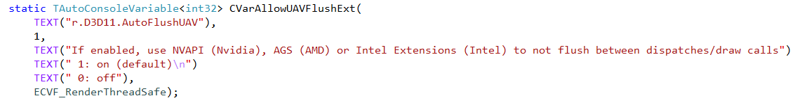 또 한 번 밤을 꼬박 새워 생각하다가, Compute Shader와 관련된 어떤 특성이 떠올랐다. 하드웨어 벤더가 제공하는 확장 API를 통해 동작하는 기능이었다. 예전에 GPU Skin Cache 최적화 작업을 할 때 접한 적이 있었는데, 내부 구현을 자세히 들여다보지 않아서 정확히 어떻게 동작하는지는 몰랐다. 다만 Compute Shader의 병렬 처리 성능을 높여준다는 것만 알고 있었다. 그게 바로 제목에서 언급한 UAV Overlap이다. 이름 그대로, 여러 UAV 워크로드가 서로 간섭 없이 동시에 실행될 수 있도록 하는, 즉 시간 축 상에서 겹치게 만드는 기능이다. 관련 코드는 아래와 같다: