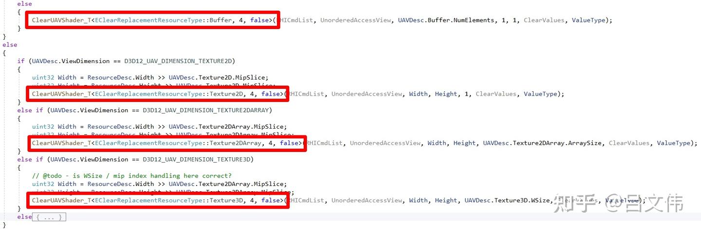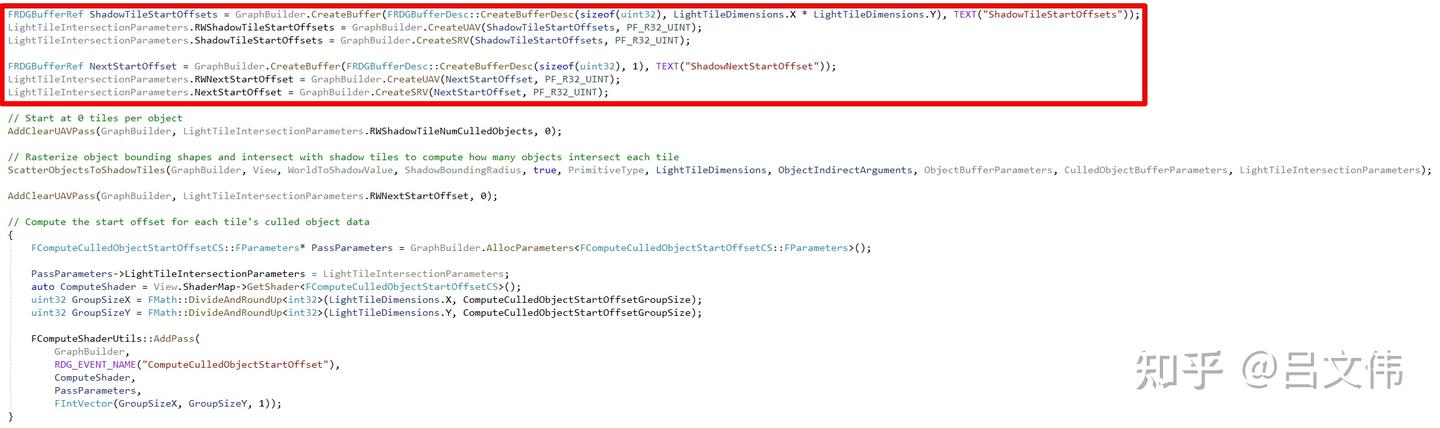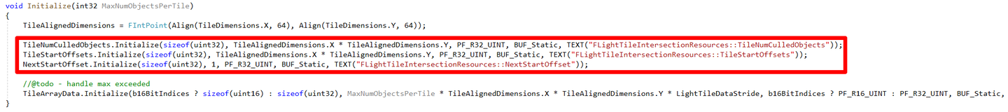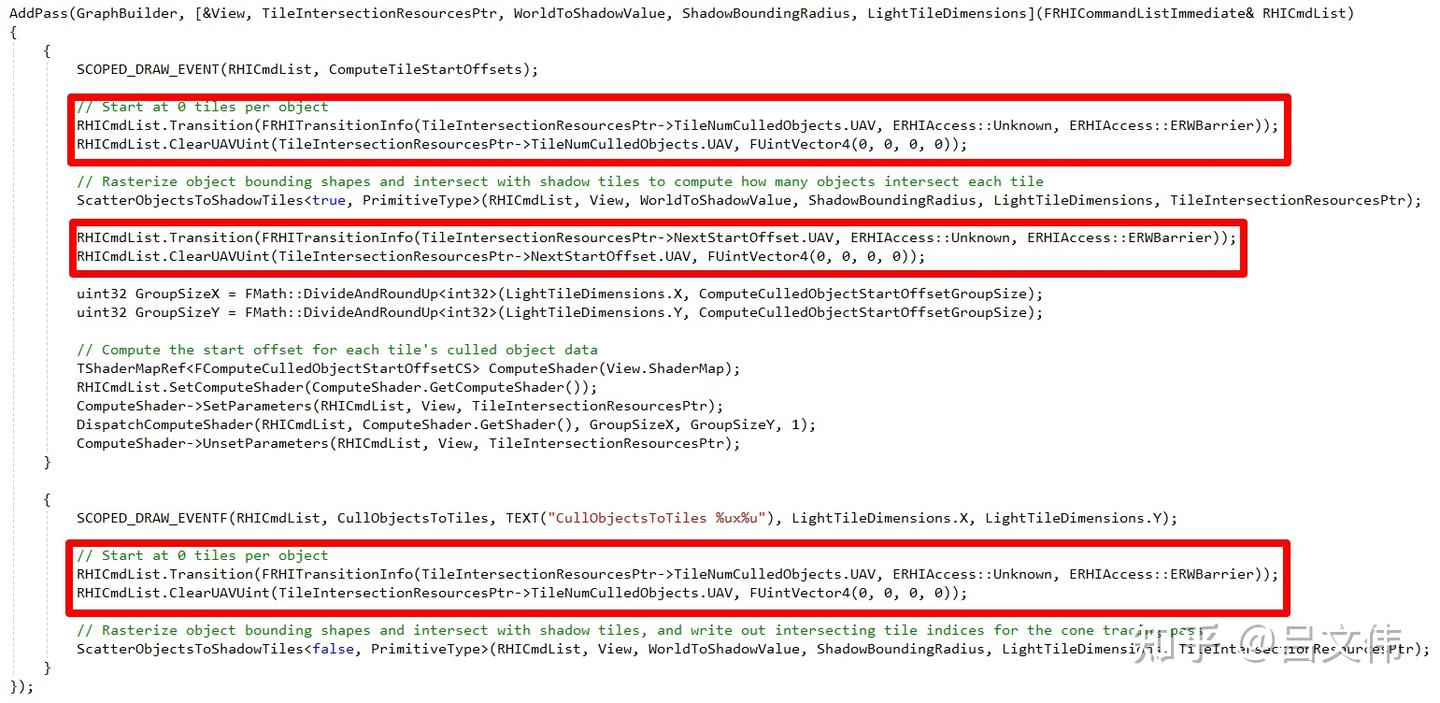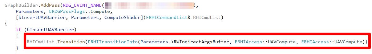 마지막으로 오래된 이야기를 하나 더 언급하고 싶다. 몇 년 전, 나는 비슷한 문제로 머리를 쥐어짜던 적이 있었다. Distance Field Shadowing이 특정 상황에서 그림자가 깜빡이는 문제였는데, 당시 도저히 원인을 알 수 없어서 이 버그를 Nvidia에 넘긴 적이 있었다. 아마 드라이버 레벨에서 해결했을 것이다. 우리 프로그램에 일종의 '뒷문'을 열어주는 방식으로, 내부적으로 강제로 동기화 포인트를 삽입했을 것이다. 지금 다시 UE4 코드를 살펴보면(아래 그림 참조), 내가 앞서 언급한 문제가 실제로 존재함을 확인할 수 있다. Buffer가 RDG를 통해 생성된 게 아니기 때문에 엔진은 패스 안에서 능동적으로 Transition을 추가했다. 하지만 ClearUAVUint 내부에서도 Compute Shader가 실행되고, 이 Compute Shader는 기본적으로 UAV Barrier를 삽입하지 않는다. 그래서 이후의 FComputeCulledObjectStartOffsetCS가 TClearReplacementCS와 시간적으로 겹칠 수 있고, 깜빡임은 필연적인 결과가 된다. 초기 GPU들이 Compute 패스 병렬 처리를 지금만큼 잘 지원하지 못했기 때문에, 이런 문제가 당시엔 쉽게 눈에 띄지 않았을 것이다.