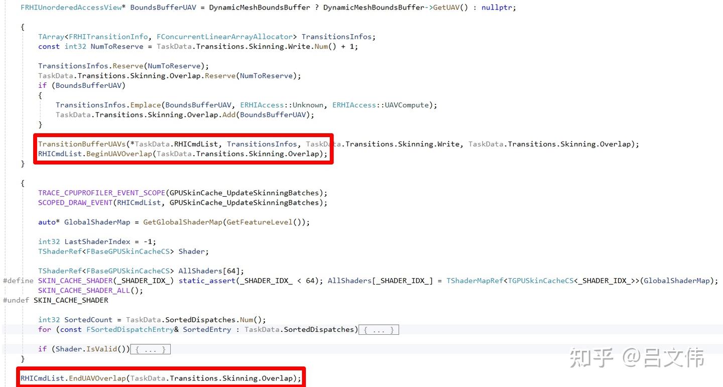 위 코드를 보면, FBaseGPUSkinCacheCS라는 Compute Shader가 BeginUAVOverlap과 EndUAVOverlap이라는 RHI API 사이에 감싸여 있다. 그리고 이 두 API는 FRHIUnorderedAccessView 타입 객체 배열을 전달받는다. 이런 구조 때문에 UAV Overlap 기능이 전달된 객체에만 적용되는 것처럼 오해하기 쉽다. 하지만 관련 코드를 직접 확인해보면 사실이 다르다는 걸 알 수 있다.