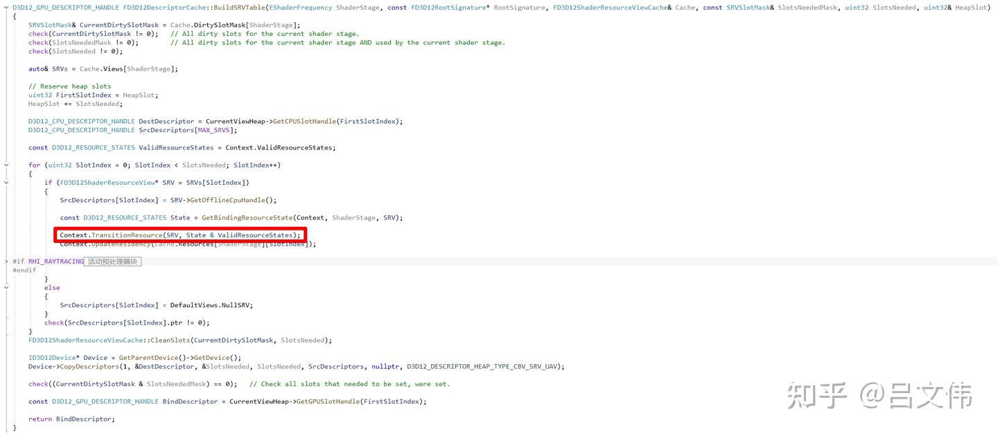 밤새 고민하다 보니 문득 한 가지 영감이 떠올랐다. RHI 내부 문제가 아닐까? 예전에 UE4에서는 주로 D3D11을 사용했고 D3D12는 거의 테스트해본 적이 없었다. 반면 현재 프로젝트는 Nanite 기능을 활성화해야 해서 기본 RHI가 D3D12였다. 알다시피 D3D12는 저수준 API라서, 원래 드라이버가 처리하던 많은 로직을 상위 레이어에서 직접 다뤄야 한다. 대표적인 예가 Resource Barrier인데, 이건 패스 간 데이터 동기화를 담당한다. 혹시 엔진이 일부 Barrier를 빠뜨린 건 아닐까? 그럴 가능성은 낮아 보였다. FRDGBuilder가 컨텍스트에 따라 패스 사이에 자동으로 Barrier를 삽입하고, 리소스 사용 상태를 추적하기 때문이다. 게다가 UE4 시절부터 존재하던 기능이 그렇게 허술하게 구현되어 있을 리 없다. Epic Games 엔지니어들이 그 정도 실수를 했을 리는 없다.