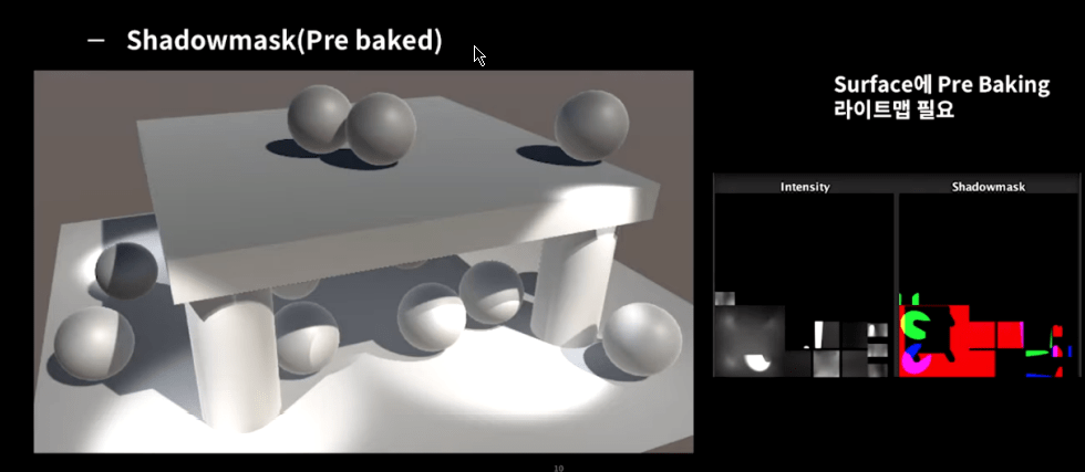 더 나은 퀄리티의 섀도를 얻을 수 있지만 표면에 미리 베이크된 라이트맵이 필요합니다.