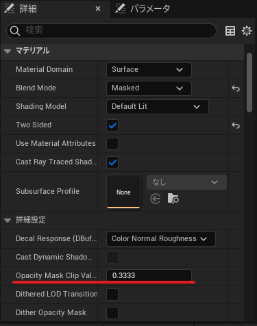 Opacity Mask Clip Value는 머티리얼의 디테일 패널에서 확인할 수 있으며, 기본값은 0.3333입니다.