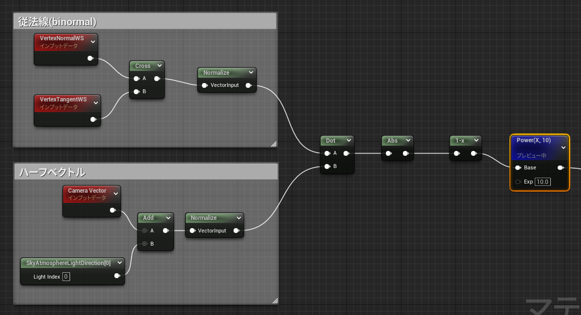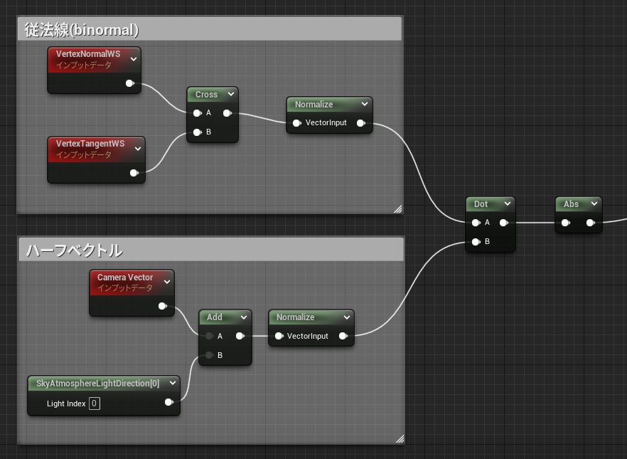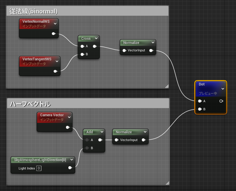 하프 벡터는 카메라 벡터와 라이트 벡터를 더한 것을 정규화하여 구하고, 종속선은 접선 벡터(tangent)와 법선 벡터의 외積으로 얻은 벡터를 정규화하여 구합니다. 내적은 dot 노드, 외적은 cross 노드를 각각 이용하여 필요한 벡터를 구합니다.