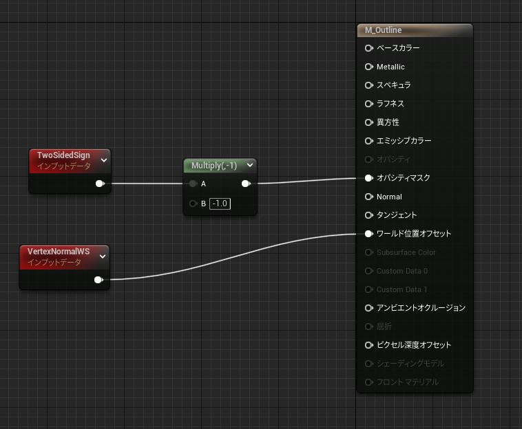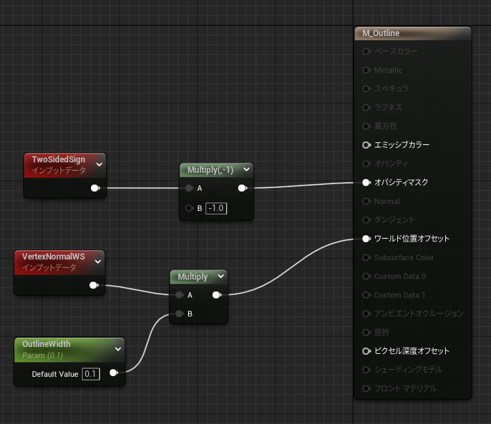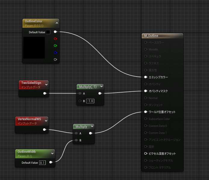 아웃라인의 색상은 기본적으로 검은색으로 설정되어 있지만, 조정할 수 있도록 파라미터를 추가해 보았습니다. 이것으로 아웃라인용 머티리얼이 완성되었습니다.