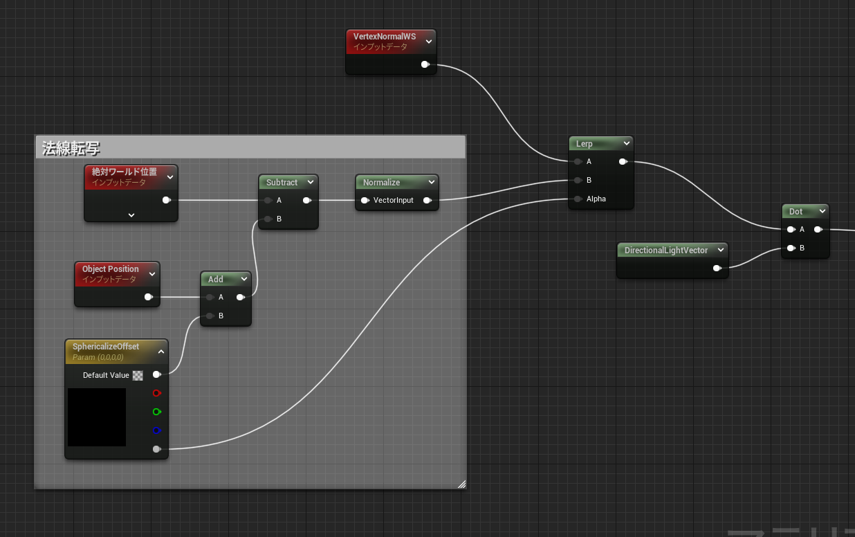 완전히 교체해도 문제가 없지만, 모델의 노멀과 구형 노멀을 Lerp에 연결하여 계산에 활용할 노멀을 조정할 수 있도록 했습니다. 또한, 노멀 투렌스터의 위치를 조정할 수 있도록 위치 오프셋을 위한 파라미터를 준비했습니다.