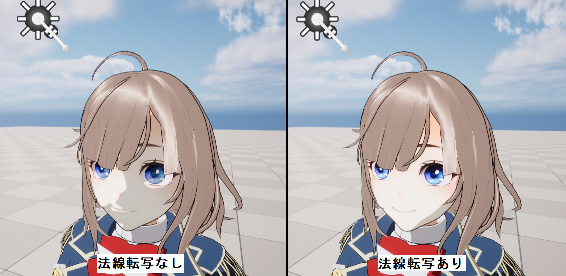노멀 트랜스퍼는 가상 오브젝트(구와 같은 단순한 오브젝트)의 노멀을 준비하여 사용할 모델의 실제 노멀을 처리하는 계산으로 대체하는 기법입니다.