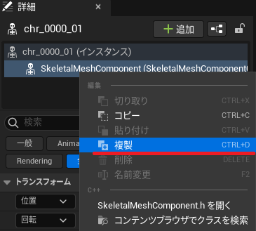 이번에는 UE 내에서 메시 복제를 진행하지만, 모델 데이터에 아웃라인용 메시를 미리 준비해 두어도 무방합니다. 메시 복제는 레벨에 배치한 모델을 선택하고 디테일 탭에서 SkeletalMeshComponent를 우클릭하여 [복제]를 선택하면 됩니다.