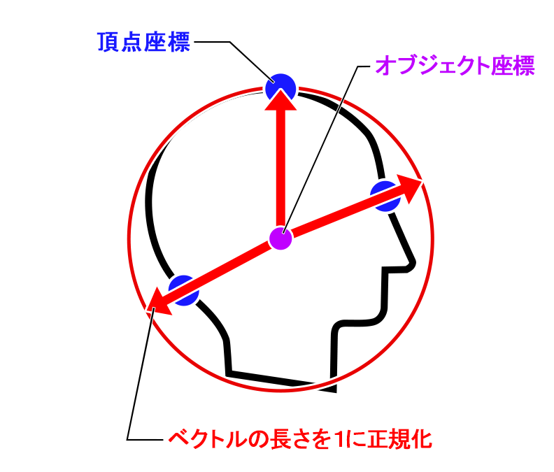 여기서는 법선 트랜스퍼를 사용하여 모델의 얼굴에 그림자를 그립니다. 먼저 가상 개체의 법선을 준비합니다. 법선이 구형이라고 가정합니다. 구형 법선은 아래와 같이 벡터 [정점 좌표 - 물체 좌표]를 정규화하여 얻을 수 있습니다.