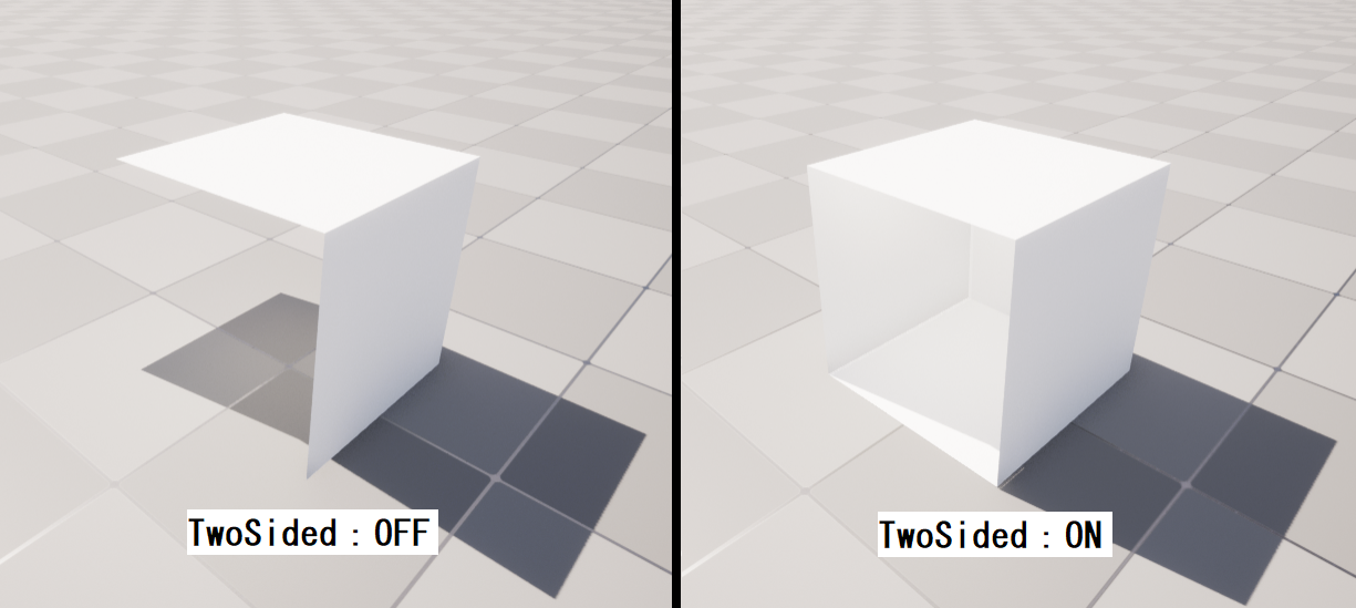 Two Sided는 양면 그리기 설정 항목입니다. 보통은 메시의 표면만 그려지지만, Two Sided를 ON으로 설정하면 뒷면도 그려집니다. 확인용 한쪽 면을 제거한 박스 메쉬에서 Two Sided 유무에 따른 차이를 확인하면 다음과 같습니다.