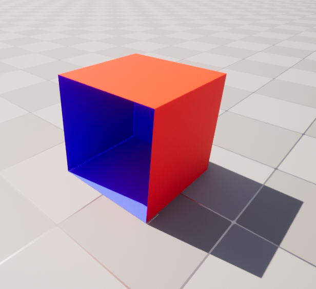 TwoSidedSign 값이 1이면 메시의 표면이면 1, 뒷면이면 -1을 반환하는 노드입니다. TwoSidedSign 값이 1이면 빨간색, -1이면 파란색이 되는 머티리얼을 확인용 박스 메시에 적용하고 그리기 결과를 확인합니다.