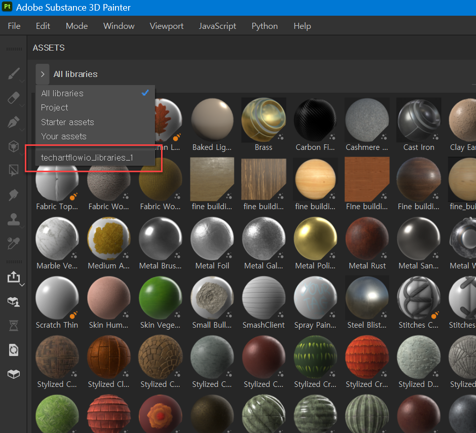 우리는 F:\Substance\CustomShelves_SP 라는 경로에 라이브러리를 구성 했습니다. 라이브러리 구성 이름은 techartflowio_libraries 로 했군요!
