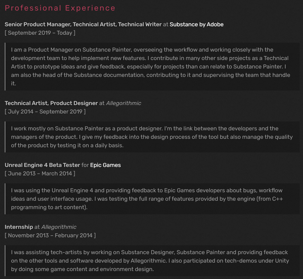 대학을 졸업하고 알레고리드믹에서 인턴쉽으로 그는 커리어를 시작하였고 현재는 시니어 프러덕트 메니저로서 여전히 서브스턴스 제품 개발과 함께 하고있는 정말 멋진 테크니컬 아티스트 입니다.
