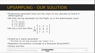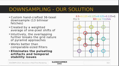 프로세스는 이전 결과를 사용하여 장면 색상 크기를 여러 번 줄이는 (다운샘플링) 작업을 수행합니다. 크기를 줄일 때마다 여러 픽셀을 평균화하여 결과를 약간 흐리게 만듭니다. 이는 에일리어싱을 줄이고 시간적 안정성을 제공하기 위해 수행됩니다. 한 픽셀에 대해 4개의 픽셀이 샘플링되므로 (즉, 2x2 박스로), 샘플링 위치는 픽셀 사이에 있어 이중 선형 필터링을 활용합니다.