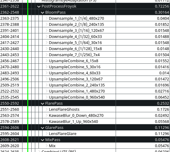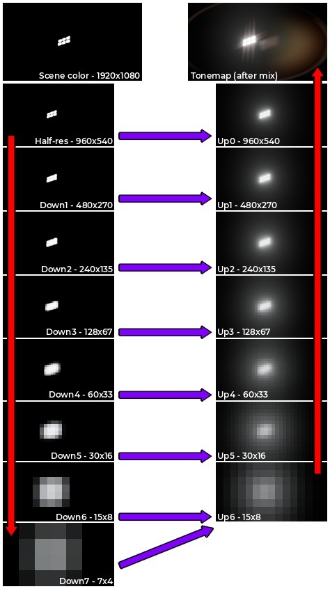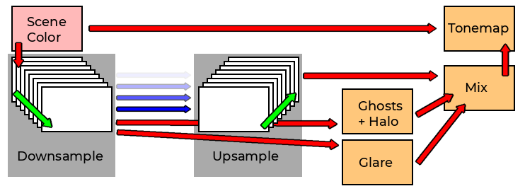 각 렌더 패스 결과는 나중에 액세스하기 위해 MipMapsDownsample 배열에 참조됩니다. 이 배열은 함수가 아닌 서브시스템 레벨에서 선언되었으며 다른 패스(특히 사용자 정의 렌즈 플레어)에서 액세스할 수 있도록합니다.