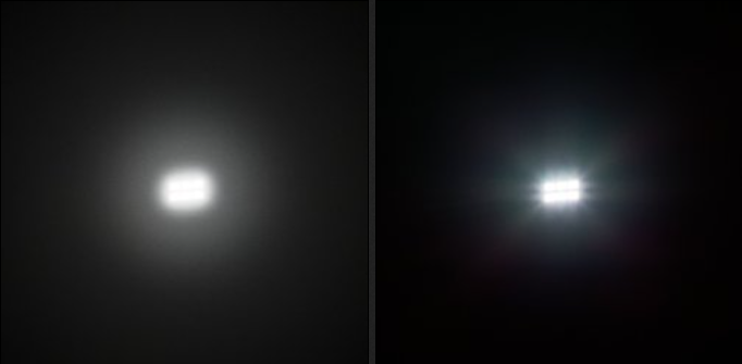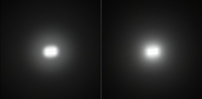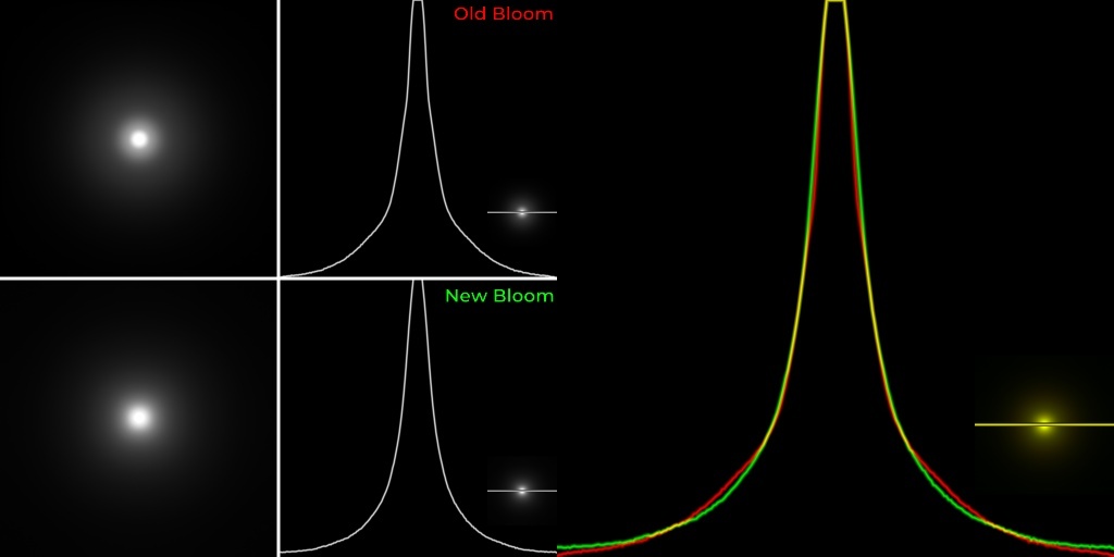 이전 방법과 새로운 방법을 정확하게 비교하기 위해, 이전 블룸의 색조를 흰색으로 만들었습니다 (기본적으로 서로 다른 회색 수준을 가지고 있습니다). 이렇게 하면 실제 흐림 효과의 모양을 비교하고 이전 방법에서 발생하는 문제를 강조할 수 있습니다: 빛의 주변에 강한 빛나침과 그 뒤로 급격하게 사라지는 꼬리.