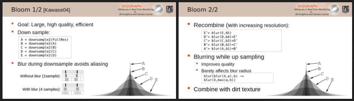 UE4에서 표준 블룸은 2012년 Elemental 데모를 소개한 이후로 거의 변경되지 않았습니다. 아이디어는 넓은 가우시안 블러를 수행하면서 GPU의 작동 방식을 활용하여 렌더링 비용을 저렴하게 유지하는 것입니다: