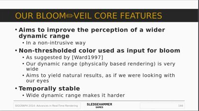 나는 컨볼루션을 기반으로 한 블룸에 대해서는 자세히 다루지 않을 것이다. 이는 실시간으로 사용하기에는 적합하지 않은 고급 후처리이다. UE5에서 미래에 더 저렴해질 수도 있지만, 현재로서는 실질적으로 사용할 수 없다.