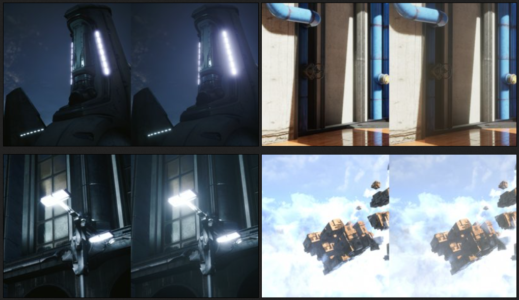 "블룸은 종종 "가리는 밝기"라고 불리며, 밝은 물체 주위에 "빛나는 광택"을 일으킵니다. 블룸은 대조 감소를 일으켜 근처 물체의 가시성을 방해합니다 [...]."