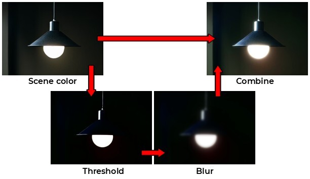 UE4 블룸을 이해하기 위해, 이 효과가 어떻게 만들어지고 최종 이미지에 혼합되는지 살펴봅시다. 많은 게임에서 다음과 같이 구현됩니다: