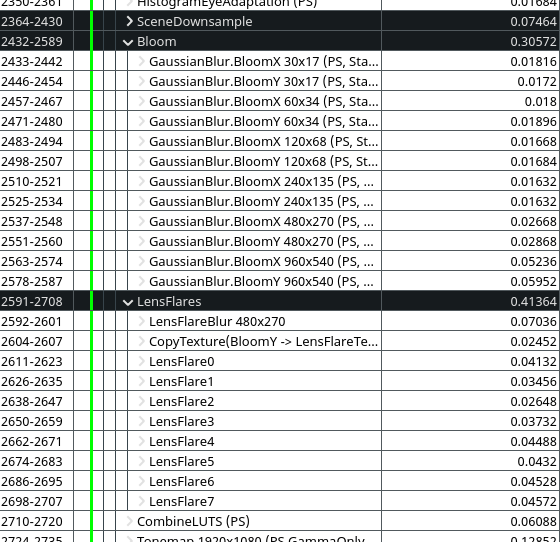 위에서 볼 수 있듯이, 우리는 원본 엔진의 렌더링 시간에 근접해 있으며 훨씬 더 품질과 외관이 좋은 최종 효과를 얻었습니다! 저는 컴퓨트 셰이더를 사용하여 이를 더욱 낮출 수 있다고 확신합니다. 예를 들어 UE4의 원본 다운샘플링은 단지 5단계로만 0.075ms입니다.