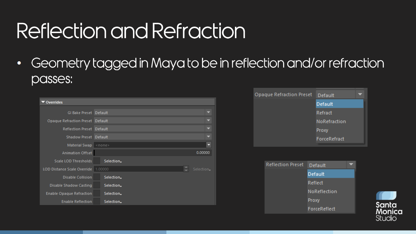 마야에서 지오메트리를 반사 및/또는 굴절 패스에 태그했습니다.
