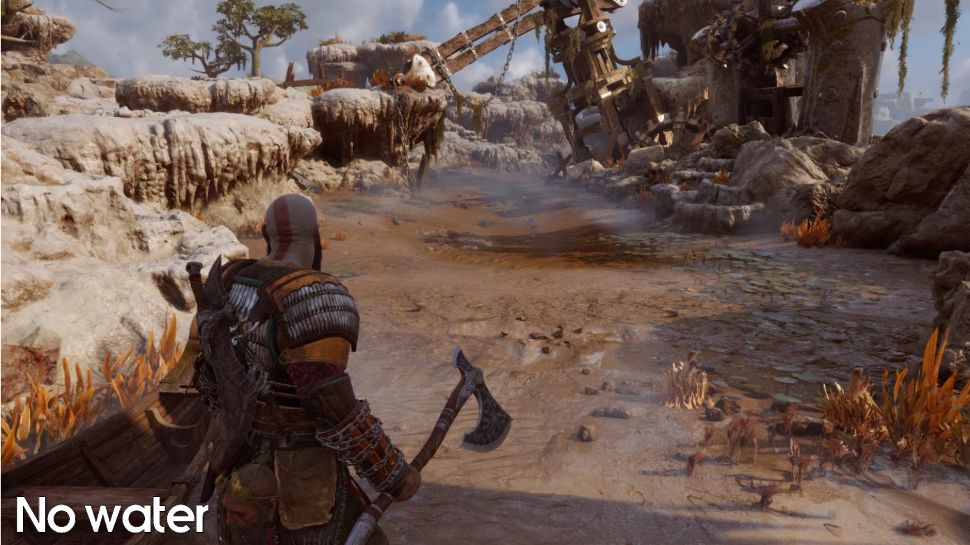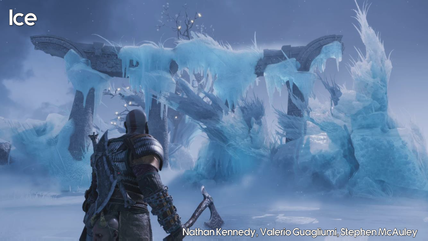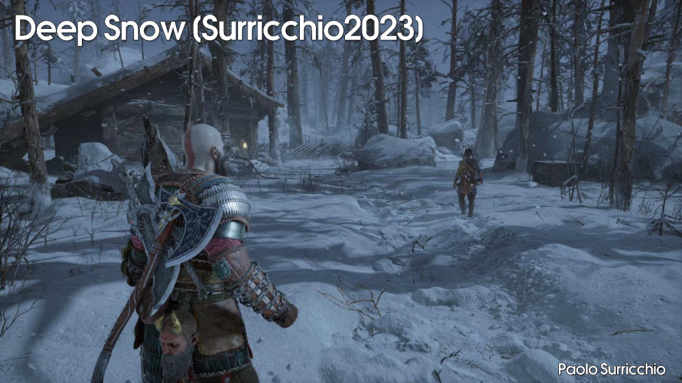 첫 번째 특징은 깊은 눈입니다. 핌불윈터를 표현하려면 핌불윈터를 표현할 수 있어야 하므로 많은 양의 눈과 캐릭터가 걸어갈 때 반응하는 기능이 필요했습니다. 이 기능은 갓 오브 War 2018에서 이 기능을 구현한 적이 있지만, 당시 사용된 기술로는 눈이 충분히 깊지 않았습니다. ( 역자 주. 이 전 버전의 눈은 화면공간 시차맵핑을 이용한... )