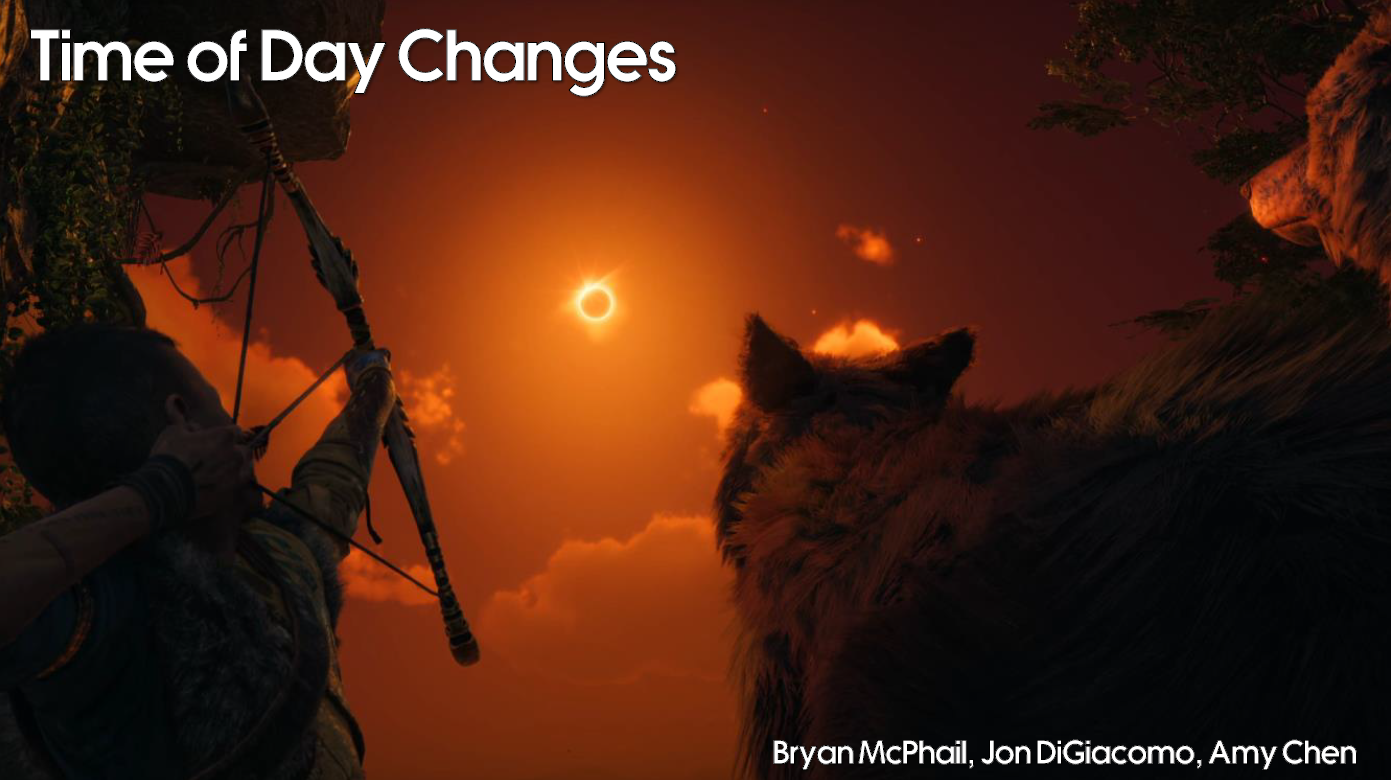 또한 이 놀라운 시네마틱으로 대표되는 바나헤임에서는 낮과 밤의 시간대를 변경할 수 있었습니다. 시간 변경은 처음 시도하는 것이었기 때문에 브라이언은 글로벌 일루미네이션 애니메이션을, 존과 에이미는 여러분이 보는 역동적인 하늘을 작업했습니다.