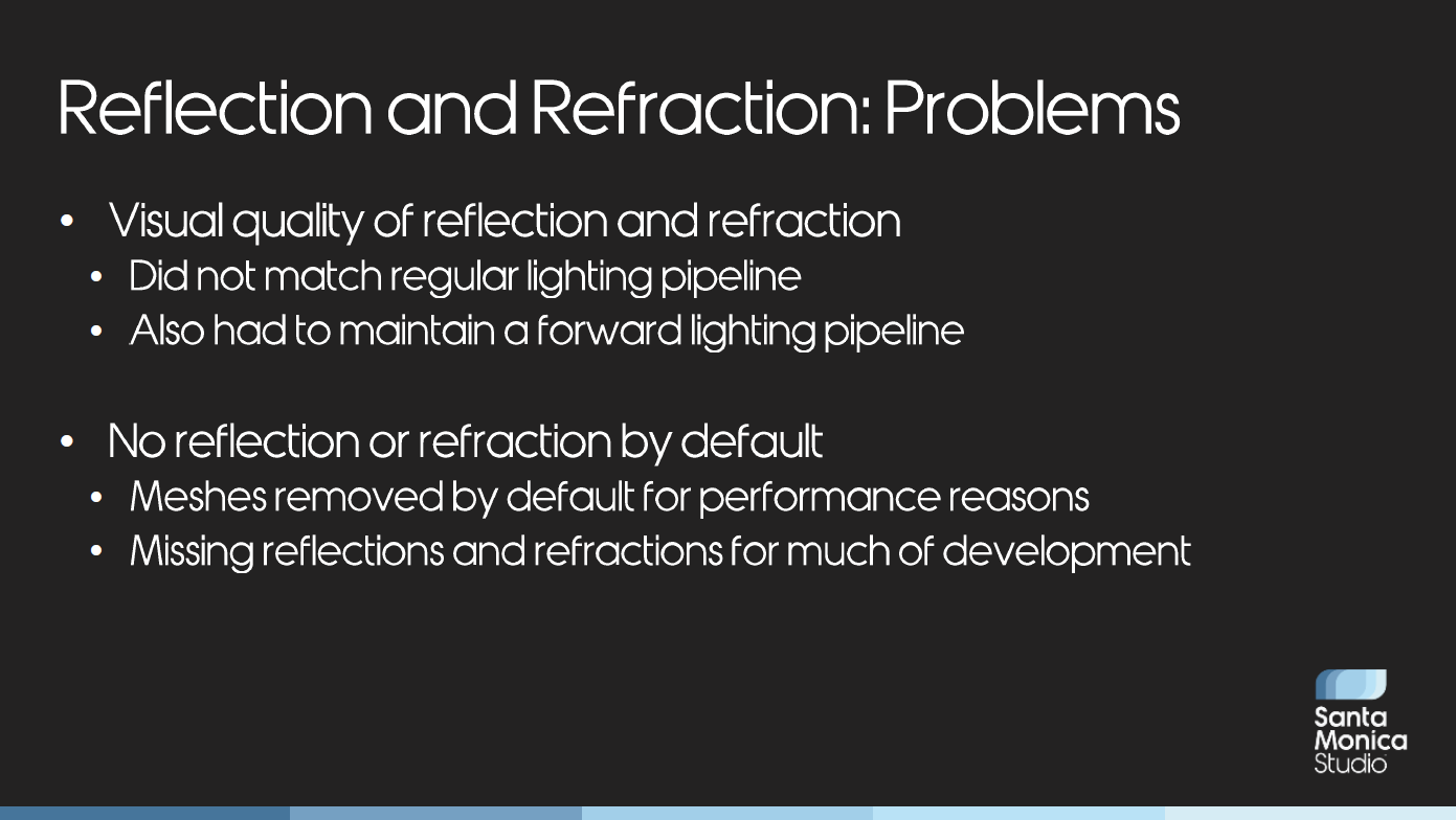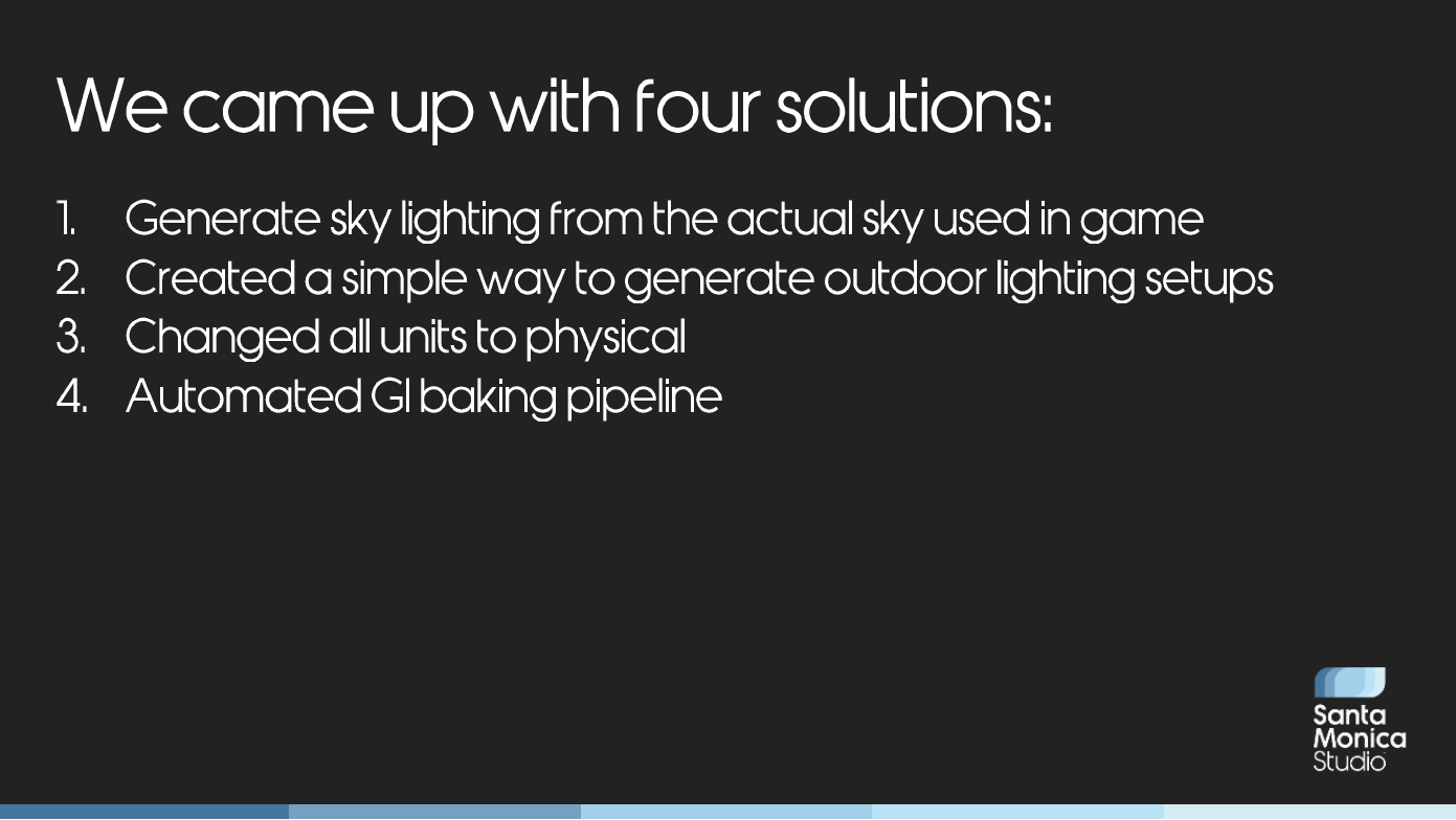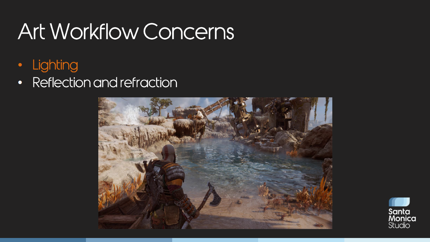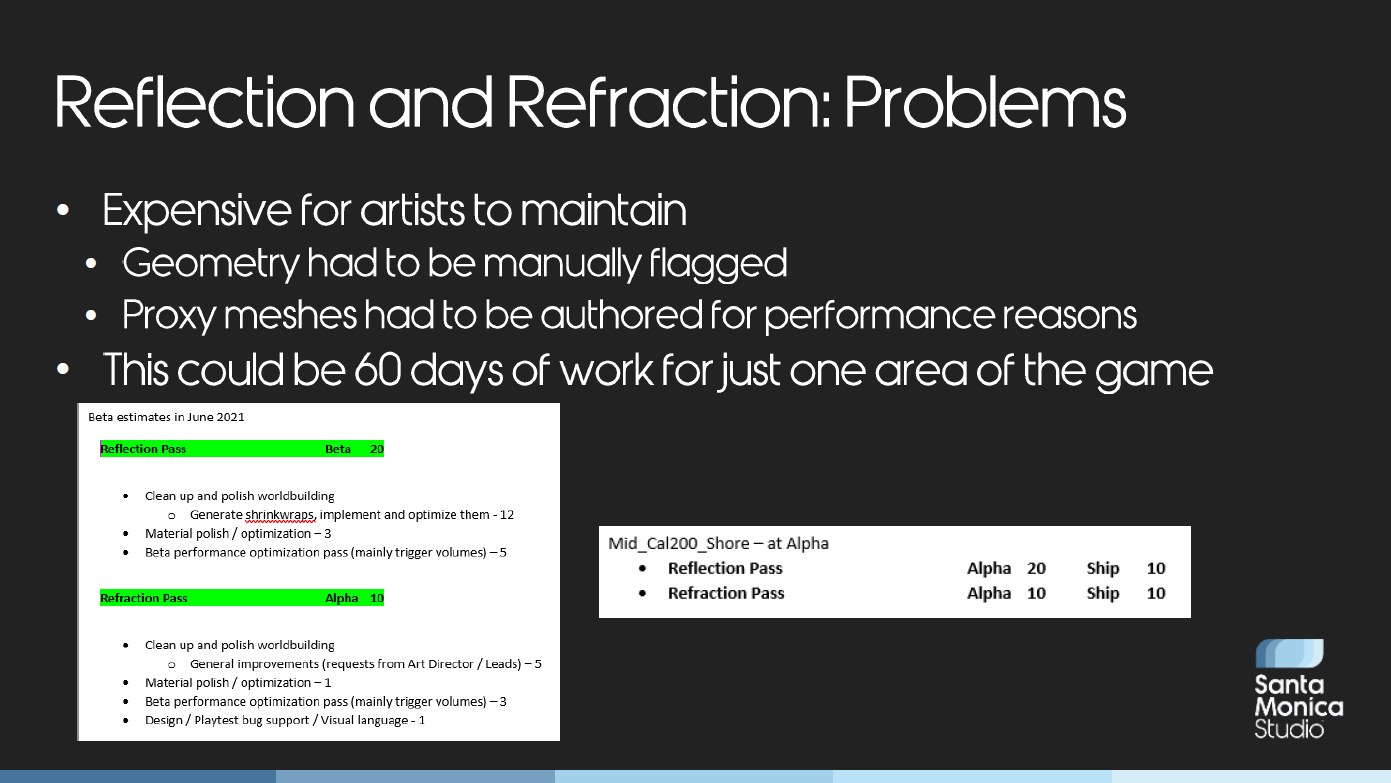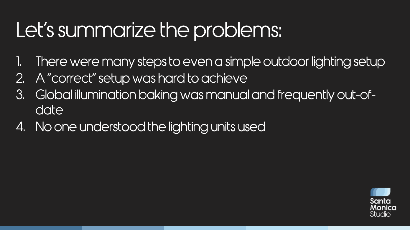 첫 번째, 조명은 제가 가장 먼저 문제점으로 파악한 것 중 하나였습니다. 조명 아티스트의 시간을 절약하는 것이 목표였던 프로젝트에서 가장 먼저 파악한 문제 중 하나였습니다. 그리고 두 번째 문제는 리플렉션과 리프랙션을 어떻게 설정할 것인가였습니다. 환경 아티스트의 시간을 절약하는 것이 목표 그러니까 전반적으로 아티스트의 시간을 절약하는 것이었습니다.