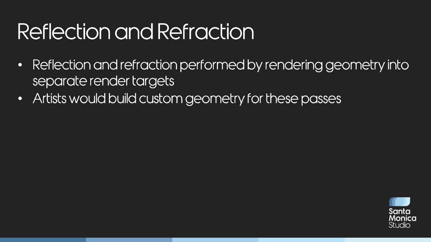 - 지오메트리를 별도의 렌더 타깃으로 렌더링하여 반사 및 굴절을 수행합니다.