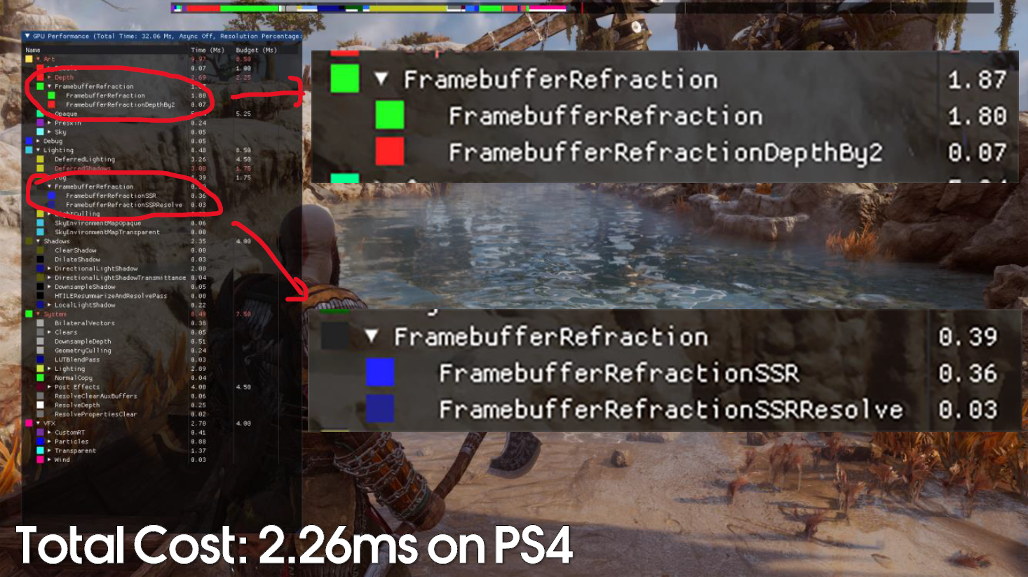 여기 물의 총 비용은 PS4에서 2.26밀리초로, 약간 비싸지만 화면의 많은 부분을 차지합니다.