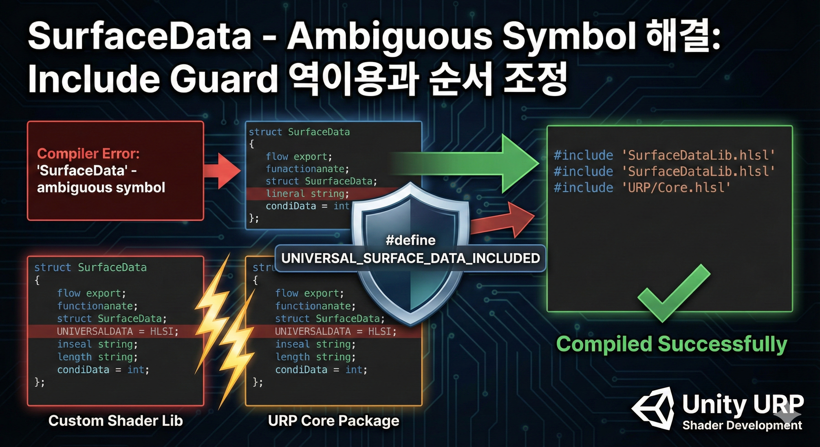 커스텀 셰이더 라이브러리를 개발하던 중 이 에러 메시지를 마주했습니다. 분명히 제대로 정의한 구조체인데 왜 모호하다는 걸까요? 원인을 추적해보니 URP 내부에도 동일한 이름의 구조체가 존재했습니다. 이 글에서는 Include Guard 활용법을 공유합니다.배경: 커스텀 셰이더 라이브러리 개발고객사 프로젝트에서 URP 기반의 커스텀 셰이더 라이브러리를 개발하고 있었습니다. 표준 URP의 SurfaceData 구조체에는 없는 추가 필드들이 필요했기 때문에, 자체적인 SurfaceData 구조체를 정의하여 사용하기로 했습니다. 처음에는 문제없이 잘 동작했지만, 라이브러리 구조를 리팩토링하면서 Include 순서가 바뀌자 갑자기 컴파일 에러가 발생했습니다.문제 상황: 모호한 심볼 에러저희 라이브러리에서는 다음과..